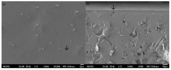 The FE-SEM inspection of UV film surface (a) and profile with 12-phr Zn(HEEP)2 addition (b).