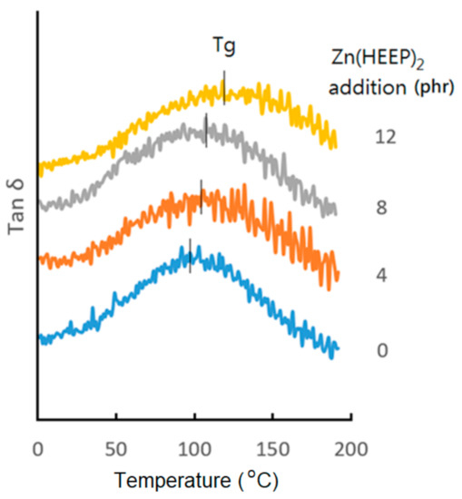 The mass retentions of with and without Zn(HEEP)2–containing films were very similar, about 72.8–73.9%. The results indicated that the crosslinking structure of UV film was not affected by the addition of the Zn(HEEP)2 and the powder would be leached out in the experiment of siphon procedure. The modulus values in the indentation hardness test also revealed that the Zn(HEEP)2–containing UV films had higher modulus of 4.70–4.82 GPa than the raw UV film of 4.35 GPa. The Tan δ curves of UV films with different Zn(HEEP)2 addition are shown in Figure 7. The more Zn(HEEP)2 contained, the higher the Tg was. The 12 phr Zn(HEEP)2-containing UV film had the highest Tg of 120 °C when compared with the raw UV film of 96 °C. The results of hardness, modulus, and Tg values of the UV films indicated that the Zn(HEEP)2 powder has a function of antibacterial agent but also acts as a body pigment filler, which can reinforce the strength of the UV film under the critical pigment volume concentration (CPVC).