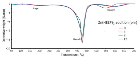 The thermogravimetric (TG) analysis and derivative thermogravimetry (DTG) are shown in Figure 8 and Figure 9, respectively, and the thermal parameters are summarized in Table 5. The degradation of UV films consisted of three dominant stages in the pyrolysis process. In the first pyrolysis stage, the weight loss at temperature about 150–200 °C was due to the evaporation of moisture, trapped eluents, and low molecular weight of additives in the films, and all of the UV films with different Zn(HEEP)2 addition had the same behavior.