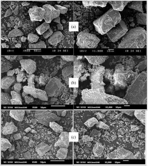 SEM analysis was performed to observe the morphology and compare the particle size of the dolomite (before and after being ball milled and tip sonicated). Figure 1 presents the SEM micrographs of the filler particles of the pristine dolomite (DOL), DOL with 10 h planetary ball milling (DOL+10H) and DOL with 10 h planetary ball milling and 2 h tip sonication (DOL+10H+2H) at 500× magnification (left) and 1000× magnification (right). Table 2 shows the surface area and particle size of all the materials. In the pristine form of dolomite (DOL), the average particles size was ~58 µm. However, upon 10 h of planetary ball milling process, the particles of the DOL became smaller and finer. The average particle size of the DOL filler was decreased from 58 to 29 μm after the planetary ball milling process of 10 h, as shown in Figure 1a,b, respectively. This implies that the ball milling process can be used to reduce the particles size of DOL. However, the SEM diagram suggests that the microcrystalline particles of DOL tends to aggregate together into large size particles. Agglomeration of filler usually occurs after being dried from the suspension form [].