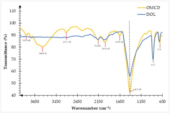 In general, the FTIR spectra of DOL and OMCD reveal that carbonate is the most major constituent in dolomite []. The magnesium carbonate (Mg2CO3) and calcium carbonate (Ca2CO3) (carbonate mineral group) exhibited the strong peak at 1415.88 cm−1, which is associated with lattice CO32− []. The appearance of spectral peaks at 3000 and ~719 cm−1 revealed the other main components of dolomite []. The FTIR absorption at 3000 cm−1 relates to organic residue, while the band at 2870 cm−1 represents the calcite combination band. The peak at 719 cm−1 is attributed to magnesium calcite or calcite []. Ji et al. stated that the FTIR absorptions at 1420, 873, and 719 cm−1 proved the presence of dolomite, which also agrees with our results [].
