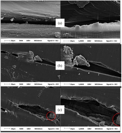 FESEM images of tensile-fractured surface of the (a) virgin PECoVA, (b) PECoVA/DOL3 and (c) PECoVA/OMCD3 composite at 500× magnification (left) and 1000× magnification (right).