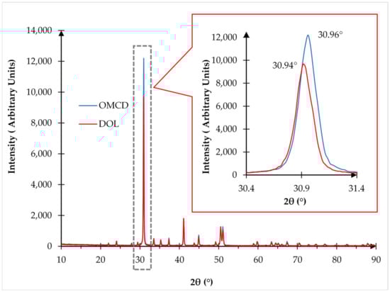 The structure of dolomite is ordered, thus its crystalline structure can be analyzed through XRD. The structures of the DOL and OMCD were characterized and compared by using XRD analysis. Figure 4 illustrates the XRD patterns of both types of filler.