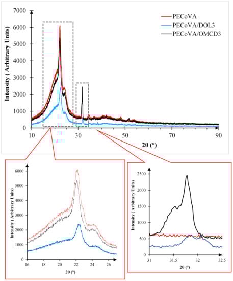 PECoVA copolymer exhibits one sharp diffraction peak centered at 2θ = 22° and a broad shoulder at 2θ = 24° due to the crystalline structure of polyethylene (PE) []. The addition of DOL caused significant reduction in the intensity of both peaks, revealing that this filler, when it exists in the agglomerated form, may induce a greater thermodynamic barrier for the nucleation process of the ethylene phase. Large particles of DOL hinder the molecular motion of the ethylene phase, restricting the arrangement of the molecules into ordered structure. Upon the addition of dolomite into the PECoVA matrix, there was a crystalline peak detected at about 31.7° for both the PECoVA/DOL3 and PECoVA/OMCD3 composites. However, the most significant difference between the diffraction of the PECoVA/DOL3 and PECoVA/OMCD3 composites was the intensity of the diffraction being stronger in PECoVA/OMCD3 composites, which is affected by the collective diffraction of all the atoms in the crystal due to better dispersed of filler particles [,]. To support the statement, the degree of crystallinity of both types of composites was measured and is tabulated in Table 4.