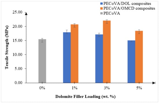 Effect of dolomite filler loading on the tensile strength of virgin PECoVA, PECoVA/DOL and PECoVA/OMCD composites.