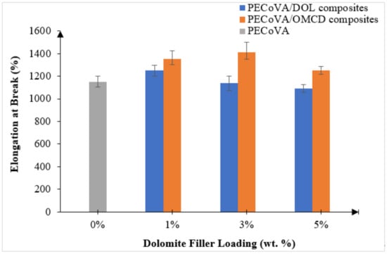 Effect of dolomite filler loading on the elongation at break of virgin PECoVA, PECoVA/DOL and PECoVA/OMCD composites.