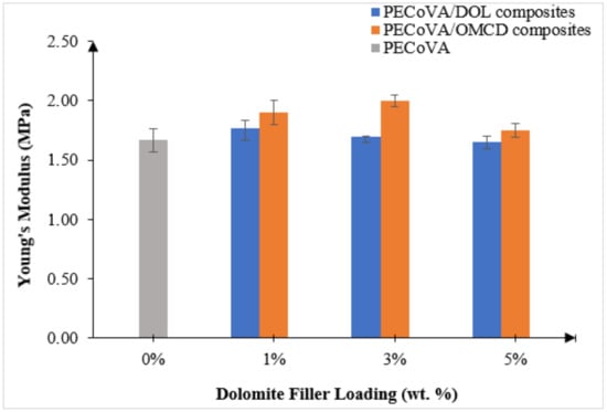 Effect of dolomite filler loading on the Young’s Modulus of virgin PECoVA, PECoVA/DOL and PECoVA/OMCD composites.