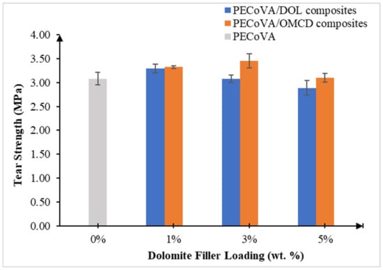 Based on the results, the addition of DOL and OMCD successfully improved the tensile strength and elongation at break of the PECoVA. In the presence of 1 wt% DOL, the PECoVA composites show an increase in tensile strength and elongation at break. However, as the percentage of DOL filler present in the composites increased from 1 to 5 wt%, the tensile strength and elongation at break of the PECoVA composites exhibit a decreasing trend. This pattern of changes indicates that the strength of PECoVA/DOL composites is compromised at high DOL filler loading. Agglomeration of dolomite leads to the formation of large particles that are not easily mixed with the PECoVA during the melt compounding process. This encouraged filler–filler interactions rather than filler–matrix interactions.