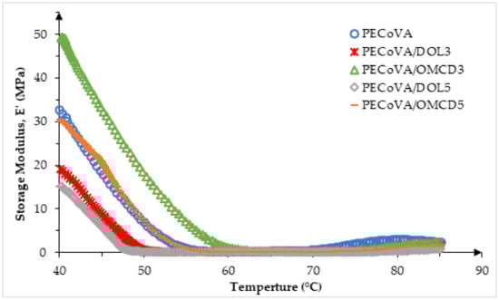 The Perkin Elmer Pyris Diamond DMA (Waltham, MA, USA) was employed to determine the viscoelastic properties of the virgin PECoVA, PECoVA/DOL and PECoVA/OMCD composites. The obtained data were used to characterize the elastic reaction deformation and analyze the damping behavior, which is useful for determining the occurrence of molecular mobility transition. Analysis was performed at 0.1% strain in bending mode using a frequency of 1 Hz and a heating rate of 2 °C/min from room temperature to 90 °C.
