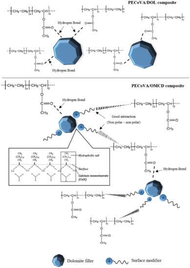 In the production of the polymer/dolomite composite, the good mixing between the polymer matrix and dolomite filler will determine the properties of the produced composites [,]. Therefore, reduction of particle size of dolomite is crucial to increase its surface area and facilitate its dispersion and distribution inside the polymer and copolymer matrices. Furthermore, a chemical modification on the surface of dolomite should be considered since inorganic filler have poor contact with organic type polymer matrix []. The dolomite particles can be disaggregated and distributed into individual micrometer size particles when an ideal chemical modification is applied. The ideal chemical modification can promote a better interfacial interaction between the dolomite particles and copolymer matrix molecular chains. Dolomite particles with different organic modifications can be optimized to be compatible with various polymer systems [].