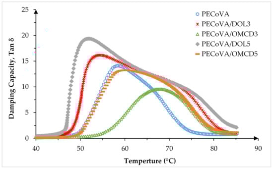 The PECoVA/OMCD3 composite indicates a lower Tan δMax that appears at a higher temperature than that of PECoVA/OMCD5, virgin PECoVA PECoVA/DOL3 and PECoVA/DOL5. The main reason was due to the existence of more restricted PECoVA chain mobility in the PECoVA/OMCD3 composite, caused by greater PECoVA–OMCD interactions. Previous research also implied that this Tan δMax that shifted to a somewhat broader peak with a higher temperature was due to more molecular mobility restriction forced by dispersed OMCD in the PECoVA molecular chains []. The results also indicated that the DOL loading brought significant influence on the damping behavior of the PECoVA composites. When the filler loading increased from 3 to 5 wt% (DOL), an increase in Tan δMax intensity was perceived. This was due to weaker matrix–filler interactions as a result of reduced quality of DOL dispersion in the PECoVA matrix.