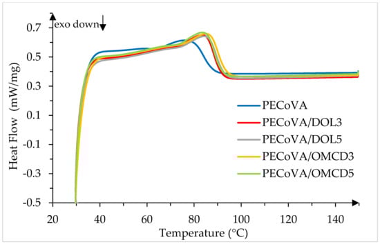 The DSC analysis was carried out in this study at temperatures starting from ~30 to 150 °C. The Tg of this PECoVA copolymer is around −70 °C according to the material datasheet. However, previous studies also stated that it was impossible to obtain Tg of PECoVA copolymers by DSC analysis, either because of a small change in heat capacity or because the crystalline phase due to the PE contained in the copolymers might hide this phenomenon [].