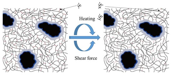 Pen70 was selected as the neat binder for modified bitumen, and the physical properties are shown in Table 1. Two conventional polymers were selected, including SBS and desulfurized crumb rubber (DCR). The average molecule weight of linear SBS was 80,000 g/mol, and the weight percentage of styrene was 30%. The DCR modifier was devulcanized by twin-strew extruder and the principle of desulphurization is shown in Figure 1. Meanwhile, rubber processing oil, which is rich in aromatics and saturates, was utilized to achieve sufficient DCR and SBS swelling in bitumen. The content of rubber processing oil was 4% by mass of base bitumen. Sulfur powder acted as crosslinking agent, and an amount of 5% of the modifiers weight was applied.