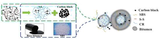 These results indicate that during the preparation of SBS/DCRMB, aromatic components and rubber processing oil are absorbed during swelling, depolymerization, and dispersion. Under the interaction with sulfur, SBS, DCR, and the SBS–DCR polymer network, i.e., the cohesive forces between polymer, as shown in Figure 4, which briefly present the mechanism of composite modified bitumen.