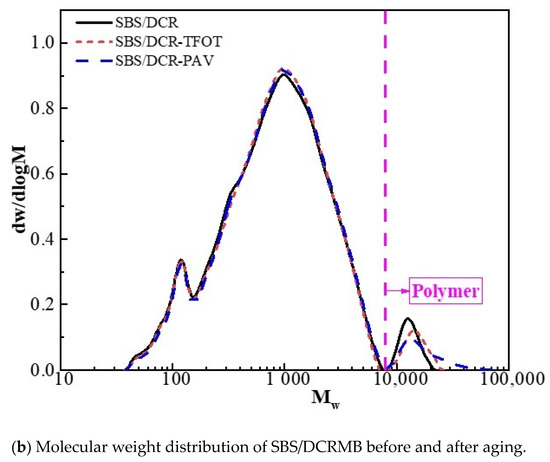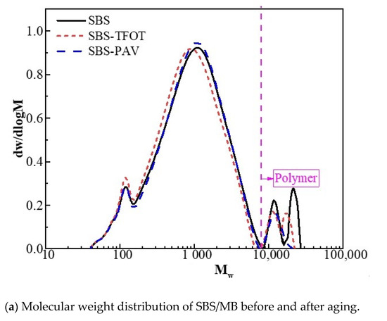 In addition, the ratio of Mn to Mw in Table 2 shows that the ratio of SBS becomes smaller. This corresponds to the polymer distribution in Figure 5a, where the dispersion of the molecular distribution becomes smaller due to degradation. However, the ratio of SBS/DCRMB follows an increasing trend, and there is a significant increase between short-term aging and PAV. This corresponds to the molecular weight distribution of the polymer part, which increases due to shown polycondensation in Figure 5b.