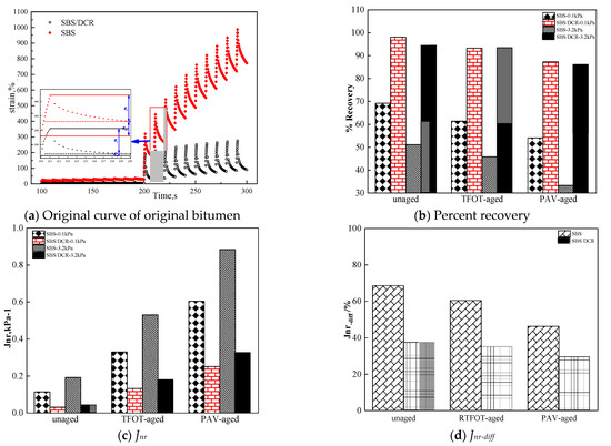 Figure 6a shows the time–strain curve of un-aged SBSMB and SBS/DCRMB in a MSCR test. With increasing test time, the original bitumen strain also increased, and the strain of SBSMB became significantly larger than that of SBS/DCRMB. Additionally, the unrecoverable creep compliance () of SBS/DCRMB is much smaller than that of SBSMB. This illustrates that SBS/DCRMB possesses much higher resilience and resistance to the high-temperature deformation than SBSMB under the same loading conditions. The remarkable anti-rutting performance of SBS/DCRMB benefits from the high elastic property of DCR and the strong three-dimensional network structure developed by DCR and SBS.