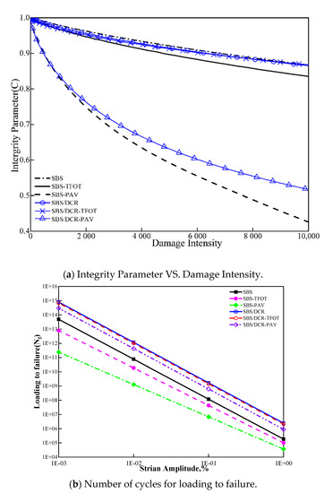 Figure 7b demonstrates that the loss rate of asphalt sensitivity decreases gradually with increase in strain level and aging degree. Comparing the loss of the fatigue life before and after aging shows that the fatigue life of SBS/DCR modified bitumen is longer than that of SBSMB bitumen regardless of the underlying aging conditions. This is caused by the addition of DCR, which can improve the fatigue resistance. It can also be found that aging conditions affect the bitumen fatigue life, and its effect is the same than that of the loss rate of the integrity parameter.