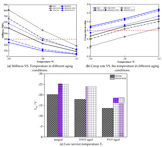 The change in stiffness modulus and the creep rate of SBSMB and SBS/DCRMB are presented in Figure 8a,b and the low service temperature (TL) of SBSMB, and SBS/DCRMB were compared in Figure 8c. The depicted results indicate that the stiffness modulus increased, and the creep rate decreased, after long-term aging at low temperature. Existing research indicates that low stiffness modulus and high creep rate are conducive to crack resistance, implying that the binder has better low-temperature performance. A comparison of the stiffness modulus and creep rate with temperature changes for different aging conditions shows that the degree of aging will increase the sensitivity of stiffness modulus and creep rate. Furthermore, regardless of the aging state, the S value of SBS/DCRMB is smaller than that of SBSMB at the same temperature, while the m value is larger. According to the AASHTO T313 standard, the minimum S value and the maximum m-value for PAV-aged asphalt binders should be 300 MPa and 0.3, respectively. From Figure 6, the stiffness values of SBSMB-PAV at 18 °C is larger than 300 MPa and m-value is smaller than 0.3, but SBSMB-PAV can meet the S value and m-value requirement at 12 °C. Therefore, the low-temperature grade of SBSMB is PG-22 and the low-temperature continuous grade is −23.64 °C. Following the same analysis, the low-temperature grade of SBS/DCRMB is PG-28 and the low-temperature continuous grade is −28.59 °C. The main reason for this is that the SBS and DCR formed a three-dimensional network; when the strain reached the limit, the fracture stress can be rapidly concentrated on the surface of DCR. Then, DCR absorbs and consumes the energy, which prevents the formation and expansion of cracks, increasing low-temperature creep deformation. After thermal-oxygen aging and pressure aging, the original bitumen developed brittle and rigid characteristics and the polymer network broke down with the degradation and condensation. These effects further increase the S value and decrease the m-value. Comparing the decay laws of low-temperature properties for different aging conditions shows that the growth of the stiffness modulus and the creep rate of SBSMB before and after pressure aging both exceed that of SBS/DCRMB.
