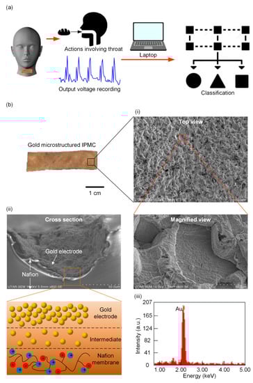 (a) A schematic drawing shows how the pattern recognition of the system is performed based on the input from a self-powered sensor that is attached to the throat. (b) Photograph of the gold-coated IPMC sensor. (i) SEM images examine the sponge-like surface morphology. (ii) SEM image and schematic illustration of the cross-sectional view of the IPMC sensor. (iii) EDX scanning confirms the formation of the metallic gold electrode.