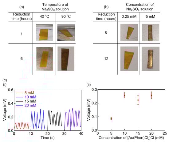 Photographs and illustrations of the (a) temperature and (b) concentration of the reducing agent, Na2SO3 solution, on the gold electrode formation. (c)(i) Temporal response of the IPMC sensor for 5 repeated cycles with different concentrations of the [Au(Phen)Cl2]Cl solution. (c)(ii) The steady-state output voltage behavior as a function of the concentration of the [Au(Phen)Cl2]Cl solution.
