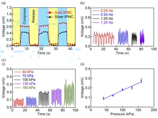 (a) Comparison of output voltages between the gold-coated and silver-coated IPMC sensors under three consecutive compress-and-release cycles. (b) Temporal response of the gold-coated IPMC sensor with 160 kPa compression pressure under different frequencies. (c)(i) Temporal response of the IPMC sensor with increased compression pressure at a constant speed of 0.5 Hz. (c)(ii) The output voltage behavior as a function of the applied pressure.