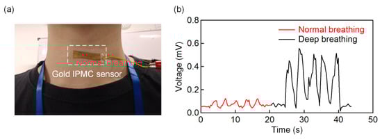(a) Photograph and illustration of how the throat sensor is attached to the throat. (b) Output voltages from the IPMC sensor for normal breathing and deep breathing.