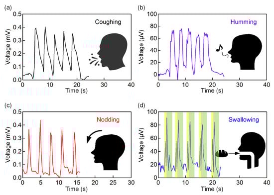 Measured output voltages from the IPMC sensor for (a) coughing, (b) humming, (c) nodding, and (d) swallowing actions.