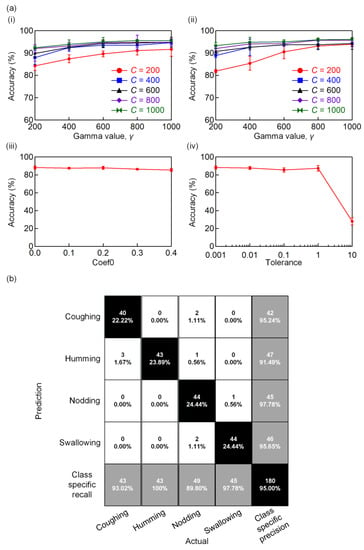 The above results reveal that the proposed IPMC sensor is capable of perceiving complex throat movements. Machine learning is an efficient approach for handling classification automatically, where the features can be extracted from the data sets for further throat movement recognition. As compared with the conventional neural network that may require a large sample size [], we developed an analytical algorithm (shown in Figure 6) using the support vector machine (SVM). This SVM algorithm can produce a higher accuracy even with a small sample size []. First, the raw voltage data in the time domain were recorded as sample features. Each action was repeated 180 times to ensure the reliability of the data set (4 actions × 180 times = 720 samples). These data were divided into 75% training datasets (540 samples) and 25% testing datasets (180 samples). The training datasets were used to train the SVM model, and the testing datasets were fed into the trained SVM model to examine the accuracy of the identification. To separate the training-set data accordingly, the kernel function was applied. Two parameters were considered in optimizing the SVM model, namely the penalty parameter, C, and the gamma parameter, γ, which were used to examine the probability of misclassification. In this work, we compared the accuracy of the recognition based on the linear kernel and radial basis function kernel, as shown in Figure 7a(i) and (ii), respectively. The optimization trials were conducted three times for each set of the parameters, and the averaged value was plotted.