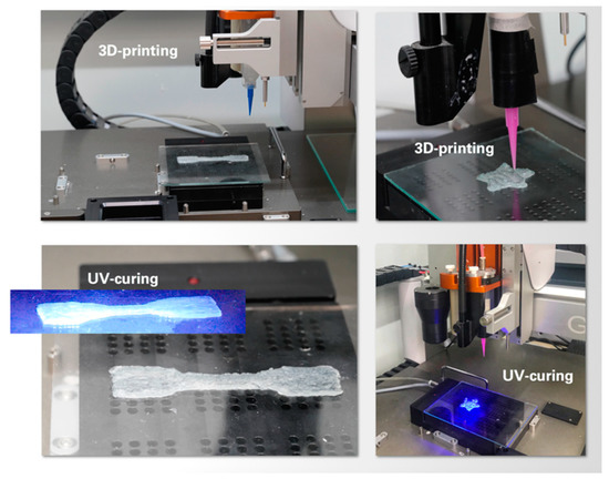 The UV-curable compositions were prepared by the addition of 48.9 and 39.6 mg of bifunctional cross-linker (N,N′-methylene-bis-acrylamide), and 48.9 and 39.6 mg of photoinitiator (2-hydroxy-2-methylpropiophenone) were added, respectively, to the CNF dispersion based on AA/ChCl (8.137 g) and AA/ImCl (7.232 g). The amounts of cross-linker and initiator were chosen as 1 wt% from the mass of the polymerizable monomer (AA). The prepared compositions were used for UV-induced polymerization in polyethylene tubes for obtaining bulk material in the form of cylinders, or 3D-printed in the form of strips (Figure 3) in order to test the mechanical properties of filaments prepared via extrusion. For this purpose, the 3D-printer 3D BioScaffolder BS3.2 (GeSIM, Radeberg, Saxony, Germany) equipped with a pneumatic syringe with a 0.58 mm diameter nozzle was applied. UV-curing in all cases was performed using UV-lampOmniCure S1500 (Lumen Dynamics, Mississauga, ON, Canada) with light power 0.15 W cm−2. All samples (including polymerized in bulk and 3D-printed) were irradiated 7 times with 15 s and 20 s pauses between irradiations.
