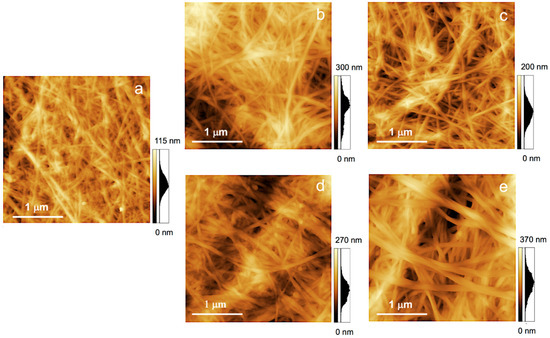 To evaluate the effects of AA containing ionic liquids on the morphology of BC, an AFM study was conducted. It was performed in two cases: (1) Only treatment with IL and (2) treatment with subsequent polymerization of AA. The height maps for the initial BC (Figure 5a), BC regenerated before polymerization from AA/ImCl (Figure 5b) and AA/ChCl (Figure 5c) demonstrate an approximately similar fibrous structure.