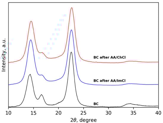 WAXD patterns of the initial BC, BC after AA/ImCl and after AA/ChCl are presented in Figure 6. Typical diffraction peaks are seen at 2θ = 14.8°, 16.6°, 22.6° and 34.4° corresponding to (1–10), (110), (200) and (004) lattice planes of the cellulose Iβ polymorph. The positions of reflections are preserved after treatment of BC with both types of used ILs. Using the Segal method [81], the degree of crystallinity () can be estimated as