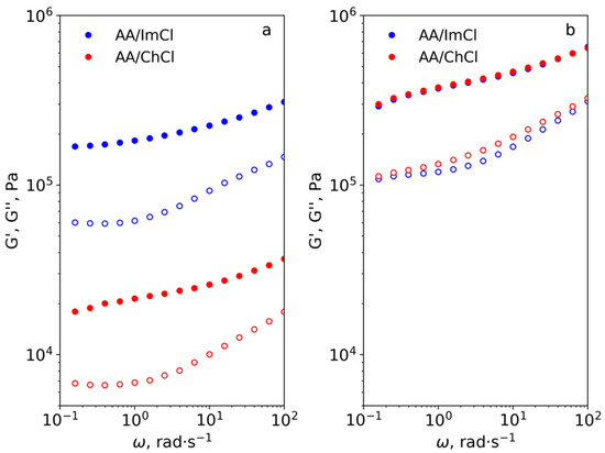 The results of viscosity measurements in the dynamic regime are given in Figure 9. The higher G’ (filled symbols)values in comparison with G’’ (hollow symbols) for all studied systems demonstrate the gel-like behavior of the material with predominantly elastic properties. This implies the formation of a strong CNF network even at the smallest cellulose concentration in dispersions. Taking this into account, it can be proposed that instability in the rheological measurements in shear mode can be connected to pronounced elastic behavior. The lack of viscous properties can result in the disruption of the CNF network at high shear rates with a sharp drop in mechanical properties. The lesser influence of CNF concentration on G’ and G’’ in AA/ImCl systems in comparison with AA/ChCl-based systems (difference between Figure 9a,b) is in agreement with results of viscosity measurements in shear mode. This demonstrates that in the case of AA/ImCl, a strong percolation network of CNF is formed even at 0.5 wt% and increasing the concentration up to 1 wt% leads to a two-fold increase of the G’ modulus. In the case of AA/ChCl, similar changes in CNF concentration lead to the growth of G’ by an order of magnitude. In the case of 1 wt% of CNF, the values of G’ and G’’ are approximately equal for both studied solvents. This means that the mechanical properties at small deformations are determined only by the mechanics of CNF. At the same time, the viscosities of these systems in shear mode are different (Figure 8) demonstrating easier rearrangement of the CNF network in the case of AA/ChCl.