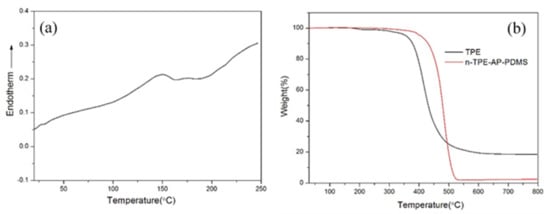 (a) DSC trace of n-TPE-AP-PDMS; (b) TGA trace of n-TPE-AP-PDMS and n-TPE recorded at a heating rate of 10 °C∙min−1 under nitrogen atmosphere.