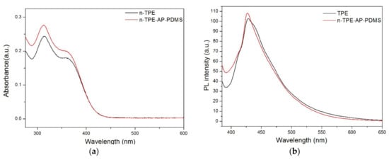 (a) The UV–vis absorption spectra of n-TPE and n-TPE-AP-PDMS in THF; (b) The photoluminescence (PL) spectra of n-TPE and n-TPE-AP-PDMS in THF; λex = 375 nm; concentration: 10 μM.