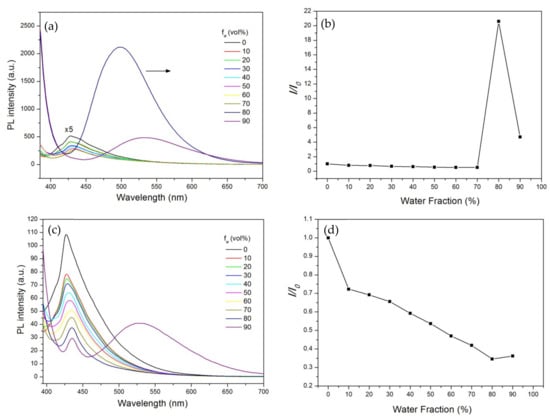 (a,b) PL spectra and changes in relative PL intensity versus different water fractions of n-TPE (The chosen wavelength for the calculation of “I/I0” is 430 nm for 0–70%, 498 nm for 80%, 532 nm for 90%); (c,d) n-TPE-AP-PDMS in THF/water mixtures. λex = 375 nm; concentration: 10 μM. (The chosen wavelength for the calculation of “I/I0” is 430 nm for 0–80%, 533 nm for 90%).