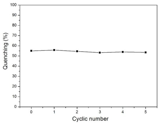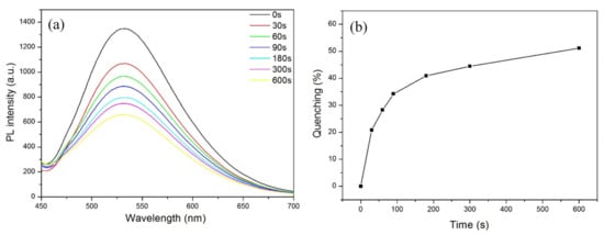 The n-TPE-AP-PDMS film was prepared via facile solvent evaporation. Then, the obtained film was exposed to the saturated nitrobenzene vapor at room temperature. Figure 5 displays the time-dependent fluorescence quenching of n-TPE-AP-PDMS film to the saturated nitrobenzene vapor. The n-TPE-AP-PDMS film showed an emission peak at 532 nm. At the exposure time of 60 s, the fluorescence intensity of n-TPE-AP-PDMS film was quenched by 28 ± 2% (quenching efficiency, (I0 − I)/I0 × 100%, where I0 and I are luminescence intensity of n-TPE-AP-PDMS before and after exposure to nitrobenzene, respectively). The quenching efficiency reaches as high as 53 ± 2% at 600 s. These results indicate that n-TPE-AP-PDMS is a promising fluorescence sensor for nitrobenzene.