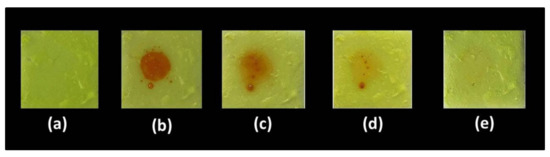 We attempted to investigate the UV spectrum of nitrobenzene and the PL spectrum of n-TPE-AP-PDMS to account for this fluorescence quenching. From Figure S6, there is no discernible spectral overlap of the absorption of nitrobenzene and the emission of n-TPE-AP-PDMS films, indicating that the energy-transfer plays a negligible role in the fluorescence quenching. Therefore, the main quenching mechanism is charge-transfer between the excited state of n-TPE-AP-PDMS and the ground state of the nitrobenzene. Moreover, the response of n-TPE-AP-PDMS film in detecting nitrobenzene liquid can be visualized by the naked eye. Figure 7 shows the color changes in natural light after nitrobenzene solution was dropped on the n-TPE-AP-PDMS film. The n-TPE-AP-PDMS film was bright yellow in natural light (a). After adding a drop of nitrobenzene liquid on the film, the position of the nitrobenzene droplets immediately turned orange-red (b). Then, by using a blower to volatilize the nitrobenzene droplet, films (c) and (d), with a gradually diminishing orange–red color, could be obtained. Eventually, the n-TPE-AP-PDMS film with the orange–red color completely disappeared and bright yellow recovered (e). In addition, the n-TPE-AP-PDMS film that recovered to bright yellow can be used for nitrobenzene liquid detection again and showed good reversibility. The results proved that the n-TPE-AP-PDMS film had excellent response to nitrobenzene and great practical value.