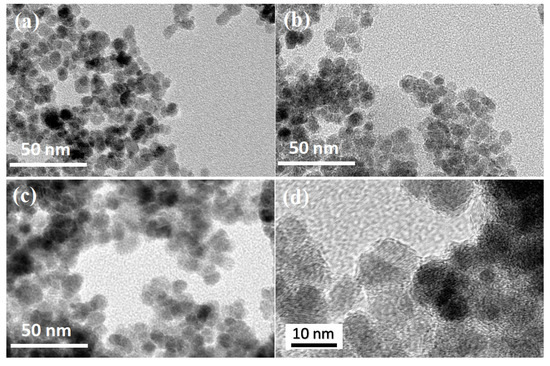 TEM morphologies of (a) Fe3O4; (b) mag-hydrogel; (c) recoated-mag-hydrogel; and (d) recoated-mag-hydrogel in a larger version.