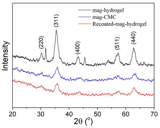 Figure 2 displays the XRD patterns of the obtained magnetic nanocomposites. Based on data of the JCPDS card for Fe3O4 (JCPDS No. 19–0629) [31], the diffraction peaks at (220), (311), (400), (511), and (440) planes can be indexed to be cubic Fe3O4 phase. These characteristic peaks were observed in mag-CMC and mag-hydrogel, which proved that Fe3O4 was contained in these synthesized nanocomposite. It can be concluded that the magnetic nanocomposites in present study have the magnetic core of Fe3O4. However, because of increasing mass fraction and different network structure of the non-magnetic polymeric shell, the Fe3O4 cores diffraction intensity were slightly reduced.