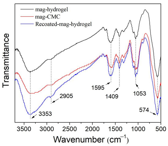 FTIR spectra of magnetic nanosorbents are illustrated in Figure 3. The sharp bands at 574 cm−1 of all the samples were ascribed to Fe−O vibrations in Fe3O4 phase [1]. Besides, the peaks appearing at 3353 and 2905 cm−1 were the stretching vibration peaks of −OH and C–H bonds, respectively. Meanwhile, 1409 cm−1 was the stretching vibration in skeletal C=C in the aromatic rings. Besides, the characteristic peaks of C=O at 1595 cm−1, and β-1,4-glycosidic bond at 1053 cm−1 were also observed. These peaks can be attributed to the cellulose structure in CMC polymer [19]. The spectra of mag-hydrogel was very similar to that of mag-CMC, no significant characteristic peak ascribed to AA or AM was observed. These may be resulted from the relatively low content of AA and AM in synthesized hydrogel shell.