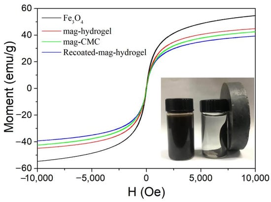 Figure 4 shows the magnetization curves of synthesized Fe3O4 magnetic nanocomposites. The saturation magnetization (Ms) of mag-CMC, mag-hydrogel, and Recoated-mag-hydrogel were found to be 42.6 emu g−1, 44.8 emu g−1, and 39.4 emu g−1, respectively, lower than that of Fe3O4 at around 54.7 emu g−1, which can be attributed to the non-magnetic polymer coating (CMC or hydrogel) out of the Fe3O4 cores. The decreasing trend of these magnetic samples in Ms were consistent with the results of XRD. The inset performance in Figure 4 affirmed that even Recoated-mag-hydrogel at lowest Ms of 39.4 emu g−1 could also be easily recovered from the waste solutions by the application of an external magnetic field.