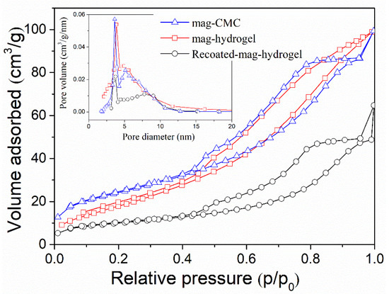 Figure 5 analyzes the specific surface area of magnetic nanocomposites by BET results. For mag-hydrogel, the BJH pore size was 5.5 nm and the specific surface area was 73.5 m2 g−1, compared to 5.2 nm and 87.2 m2 g−1 of mag-CMC, respectively. Recoated-mag-hydrogel has higher pore size of 6.1 nm and lower surface area of 35.3 m2 g−1. These results revealed that the specific surface area of the core-shell nanocomposites decreased with the increasing thickness of the outer polymeric shell. Besides, because of the porous inner structure of hydrogel, the nanosorbents with hydrogel coating has larger pore sizes, which is beneficial to the adsorption performance.