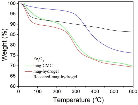 TGA can be employed to quantitatively assay the amount of substrate-attached material that remained on the surface, the TG results are shown in Figure 6. Gradual degradation within 20–180 °C resulted from the removal of free and combined water. The weight loss from 200 to 350 °C corresponded to the decarboxylic process of CMC, AA, or AM molecules. At higher than 350 °C, the weight loss was related to the breaking of C–O bonds in the CMC or CMC-g-p(AA-co-AM) structure. When all the samples were heated up to 500 °C, no distinct difference in weight loss was observed, demonstrated that only iron oxide was present in this step. On the basis of TG curves, the mass fraction of outer CMC or hydrogel shell were 17.6 wt%, 17.5 wt%, and 20.3 wt% for mag-CMC, mag-hydrogel, and Recoated-mag-hydrogel, respectively.