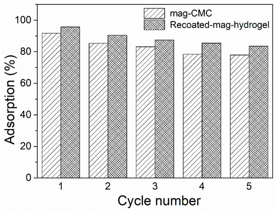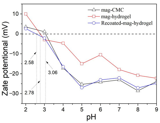 Figure 7 depicts the zeta potential data of as-prepared magnetic nanocomposites. The pHzpc of mag-CMC and mag-hydrogel were identified to be 3.1 and 2.8, respectively. Since the magnetic nanocomposites in present study have the magnetic core of Fe3O4, it is worth noting that the pHzpc of mag-CMC or mag-hydrogel were lower than that of Fe3O4, ranging from 6.0 to 7.0 as reported in the previous studies [32], suggesting the successful covering of CMC or hydrogel outside the Fe3O4 cores. For mag-CMC, the pHzpc at 3.1 was also lower than that of CMC at pKa value of 3.2–4.3 [33], which could be tentatively interpreted as resulting from the different synthesis condition. At present work, CMC molecules were facilely adhered to the Fe3O4 surface by electrostatic self-assembly approach. The specific active FeOH groups on the surface of Fe3O4 could effectively be replaced by the carboxyl groups of CMC, resulting in composite samples with reduced zeta potential [34,35]. Besides, the pHzpc of mag-hydrogel (2.8) and Recoated mag-hydrogel (2.6) was lower than that of mag-CMC (3.1), because the surface charge was also dependent on the ionization degree and 3D structure in CMC-g-p(AA-co-AM) hydrogel [34].