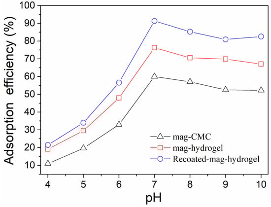 Effect of solution pH on MB adsorption efficiency by using present magnetic nanocomposite has been studied. As shown in Figure 8, for all the absorbents, in the pH range of 4.0–7.0, the absorption efficiency of MB increased with increasing pH value. As mentioned above, the mag-CMC or mag-hydrogel nanosorbent had a pHzpc value of 2.5–3.0. Therefore, within the measured pH range (Ph > pHzpc), the surface of these adsorbents were negatively charged. In addition, the surface would become more negatively charged with increasing pH because of the decreasing concentration of H+ ions in MB solution, which was more favorable to the strengthening of the chemical interaction between the cationic dye and the deprotonated surface sites [36]. However, at pH of 7.0–10.0, the adsorption efficiency of all the adsorbents slightly decreased, the reason might be that most of the adsorption sites on the surface of the adsorbents were combined and occupied by the large amount of OH- ions in that pH solution. Higher adsorption efficiency of MB at 91.3% was observed by using Recoated-mag-hydrogel nanosorbent. Since CMC, AA, and AM were all anionic polymers with sufficient negatively charged binding sites, MB was a cationic dye that can bind easily to the negatively charged sites in anionic adsorbents. Therefore, CMC-g-p(AA-co-AM) based hydrogel had a very good affinity for combining of MB molecules. Moreover, higher mass fraction of hydrogel layer would increase the dye binding sites of the core-shell magnetic nanosorbent.