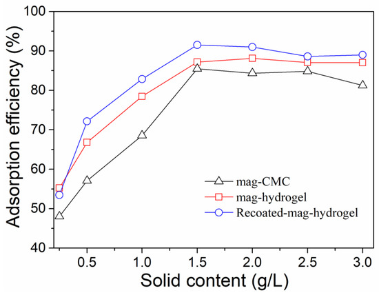 Effect of adsorbent content on MB adsorption efficiency by using the present magnetic nanocomposite was studied. As illustrated in Figure 9, the adsorption efficiency of the dye was increased when the adsorbent loading amount increased, higher than 90% was obtained with 1.5 g L−1 adsorbent content for all three samples. The high MB adsorption efficiency resulted from the increase in the number of active adsorption sites on adsorbents to form complexes with dye. However, the adsorption efficiency of MB remained stable with the further addition of adsorbents. Higher adsorbent dose could result in the super-saturation of the suspension that lead to the collision and aggregation of magnetic nanoparticles [13]. As a result, the greatly reduced availability of surface sites would decrease the adsorption efficiency of MB dye.