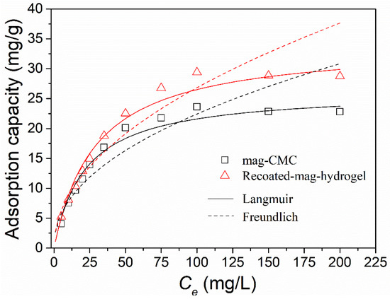 The relationship between the adsorption capacity (qe) of magnetic nanocomposites and MB concentration (Ce) at equilibrium in aqueous solution was plotted in Figure 10. The initial MB concentration ranged from 0 to 200 mg L−1. Obviously, the equilibrium amount of dye adsorbed increased with increasing initial dye concentration whether the magnetic nanosorbents shelled with CMC or hydrogel.