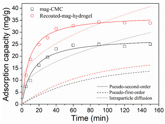 It was found that the adsorption data were well followed to Pseudo-second-order model with higher R2 of 0.99. Besides, the theoretical calculated qe,cal in Pseudo-second-order model gives a better agreement with the experimental data qe,exp. The phenomenon demonstrated that the rate controlling process of the magnetic nanocomposites was limited by chemisorption rather than physical interaction or mass transport, similar results were reported in the literature [3,46]. More specifically, surface complexes would be formed because of the chemisorption of MB on magnetic. In Table 3, k2 was found to be higher in Recoated-mag-hydrogel than in mag-CMC, suggesting that the magnetic adsorbents with hydrogel shell had a faster adsorption of MB. The reason might be that in the adsorption process the abundant channels and pores in porous hydrogel structure would lead to higher degree of dye distribution over its surface.