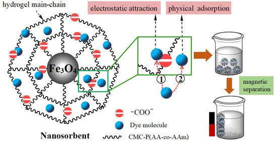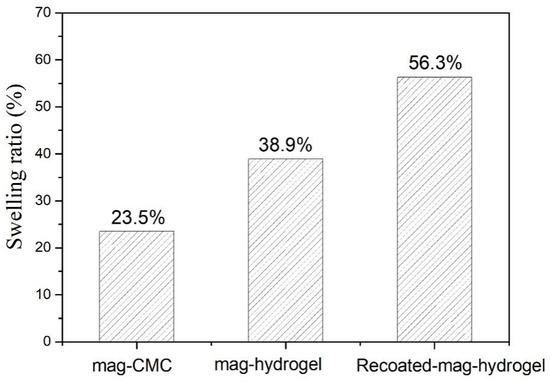 It was found that the maximum adsorption capacity of mag-hydrogel was considerably higher than that of mag-CMC nanocomposite. In addition, recoating hydrogel shell outside the surface of Fe3O4 core would also efficiently increase the MB adsorption. Similar changes also occurred in the swelling ratios as shown in Figure 12. Therefore, it can be concluded that the surface property of the adsorbent was the main factor that can control the mass transfer rate [26]. However, the specific surface area of as-prepared mag-CMC (87.2 m2 g−1) was higher than that of mag-hydrogel (73.5 m2 g−1). This means that the adsorption capacity difference was not induced by the specific surface area. Alternatively, the surface-linked hydrogel moieties played a critical part in promoting the adsorption capacity toward MB. Firstly, CMC-g-p(AA-co-AM) moieties could provide plentiful active groups in its structure, which was expected to be beneficial for binding of dye, including the electrostatic interaction resulted from the exchange or sharing of electrons between the anionic hydrogel and cationic dyes. Secondly, compared with overlapping of CMC chains on the magnetic cores, abundant channels and pores were existed in the 3D polymer framework of swollen hydrogel, which might increase the affinity to contaminants and promote dye diffusion through the adsorbent pores (Figure S1).