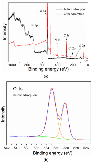 Finally, in order to study the attachment mechanism of MB on the mag-hydrogel, the mag-hydrogel before and after MB adsorption was investigated by XPS techniques. As depicted in Figure 13a, in addition to the characteristic peaks of C 1s (285.1 eV), O 1s (532.8 eV), Fe 2p (710.9 eV), S 2p (164.7 eV), Cl 2p (198.9 eV), and N 1s (407.3 eV) peaks clearly appeared for the mag-hydrogel after adsorption, suggesting that the MB molecules were adsorbed on the mag-hydrogel. Figure 13b,c illustrate the deconvolution of O 1s peak of mag-hydrogel with and without adsorbed MB. The two peaks observed at 532.79 and 532.81 eV were due to the O in carboxylate or carbonyl groups (O–C=O, C=O) [47]. Before adsorption, the peaks of O 1s at 530.2 eV was possibly ascribed to the Fe–O–C and/or Fe–O bond. This possibility was explained by the fact that the metal–O–C bonds formed in composite nanoparticles would shift to a somewhat higher binding energy from the metal-O bonds of metal oxides, and the characteristic peaks of the lattice oxygen in Fe3O4 (Fe–O) were reported at lower than 530 eV [48,49,50]. After adsorption of MB, the Fe–O–C and/or Fe–O bond was shifted to higher binding energy at around 531.2 eV, besides, the C=O/Fe–O–C area ratio was found to reduce after adsorption of MB, these results might be related to the electrostatic attraction between –COO− groups of the hydrogel and NR4+ of MB [51]. Moreover, the considerable specific surface inside the porous hydrogel allowed the dye molecules physically-adsorbed in the narrow channels of the hydrogel internal structure. As result, double effects, including electrostatic attraction and physical adsorption, might control the adsorption properties of the mag-hydrogels. Figure 14 illustrates the schematic diagram of the proposed interactions between mag-hydrogel and MB dye.